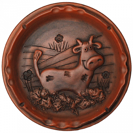 Подарочное панно блюдо в виде веселой коровы, которая гуляет на лугу.